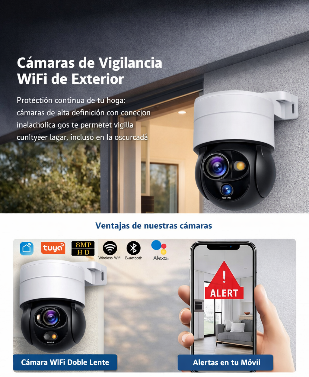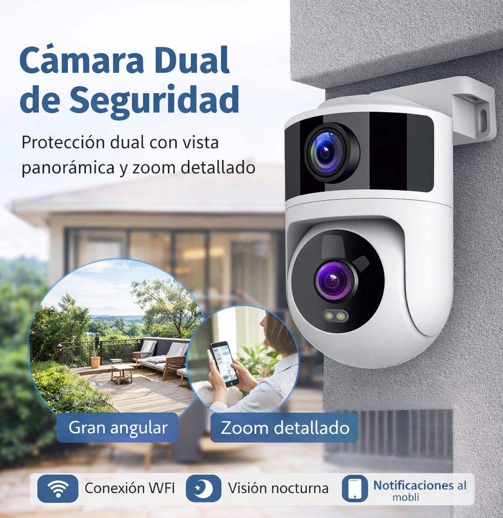 Protege tu hogar con una cámara de seguridad de doble lente que ofrece visión panorámica y zoom detallado en un solo dispositivo. Ideal para terrazas, jardines, entradas y zonas exteriores que requieren vigilancia precisa.